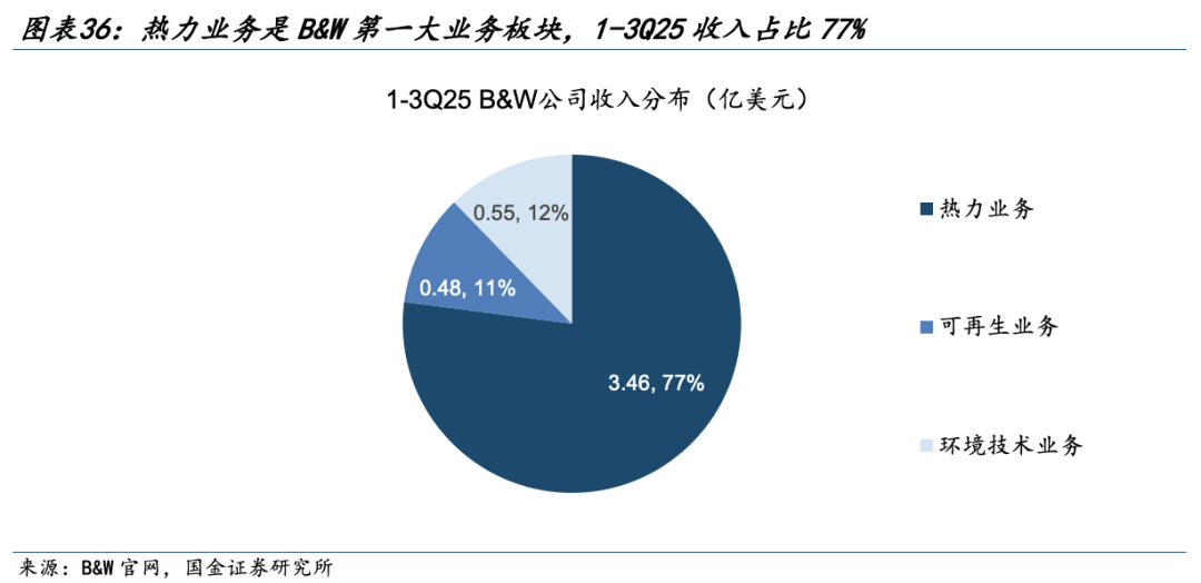 美国巴威公司(Babcock & Wilcox)创立于 1867 年,是全球领先的为电力和工业市场提供能源和环保技术与服务的公司,包括三大业务板块:1)热力业务:提供蒸汽发电设备(包括余热锅炉),售后零件,为发电、石油和天然气以及工业部门的工厂提供建筑、维护和现场服务。2)可再生能源业务:用于高效和环境可持续发电和供热的高成本效益技术,包括垃圾发电、太阳能建筑和安装、生物质能和纸浆和造纸工业的黑液系统。3)环境技术业务:一流的排放控制和环境技术解决方案,适用于世界各地的公用事业、废物转化为能源、生物质、炭黑和工业蒸汽生成应用。其中,热力业务是第一大业务板块,1-3Q25,B&W公司实现收入,4.49亿元,其中热力业务3.46亿元,占比77%。