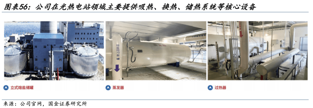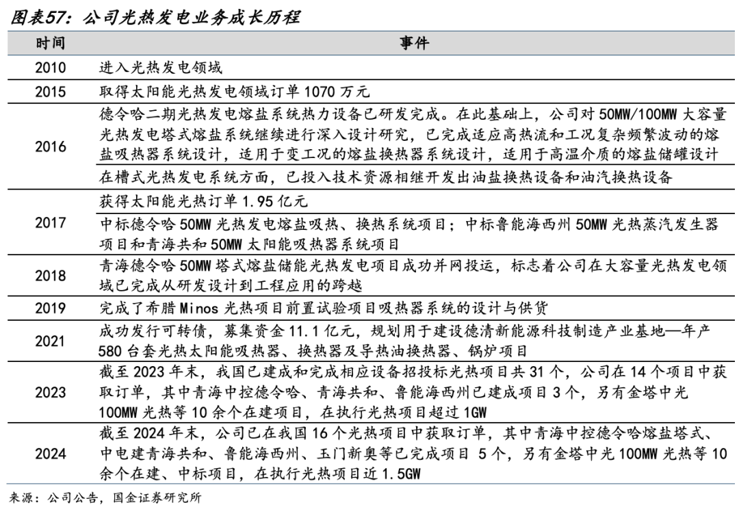 国内清洁能源装备龙头,业务从余热锅炉拓展至核电和熔盐储能领域。公司从70年代开始研发余热锅炉,已有近50余年的产品经验,产品覆盖了GE、西门子、三菱、安萨尔多等全球头部燃机供应商的各类主力发电机型,燃机余热锅炉国内份额超50%。1998年,公司进入核电常规岛装备制造领域,是中广核集团、中核集团的合格供应商,并拥有民用核安全二、三级设备制造许可证,已为全国多座核电站提供186台常规岛压力容器和换热器,以及435台核2、3级压力容器和储罐。2010年,公司进入光热太阳能发电领域,现已成功参与17个光热发电示范项目的供货与建设,其中参建的青海德令哈50MW光热项目是中国首座、全球第三座商业化投运的塔式熔盐光热储能电站。