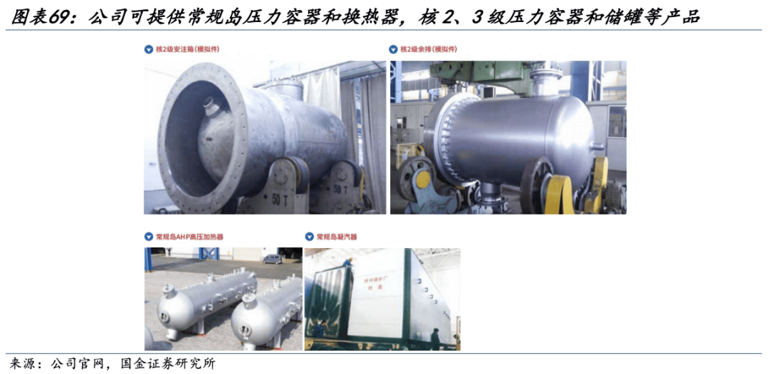 公司未来将加大核电产业布局,打造业绩新增长点。公司拥有核级制造车间,具备成型工艺、机械加工、核级焊接、核级无损检测、热处理及水压试验等完整的核级设备制造能力。公司规划,未来将依托成熟的核电装备制造能力,积极参与核电站设备供应,并聚焦核岛关键设备制造,积极向三代核电、四代核电领域拓展。同时,在核聚变领域,目前公司已具备核聚变装置冷却水系统三级回路设备的全流程供货能力。未来,公司将力争承接二级回路设备供货项目,并同步拓展杜瓦结构的生产制造能力,打造未来新的增长点。