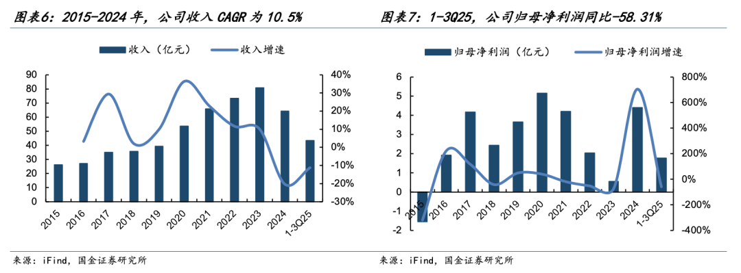 收入长期稳健增长,利润端2025年持续高增。2015-2024年,公司收入从26.2亿元提升至64.37亿元,CAGR为10.5%,长期稳健增长。其中2024年由于国内余热锅炉市场增速放缓,公司收入同比-20.33%,但是公司大力拓展海外市场,不断优化订单结构,全年毛利率为18.47%,较2023年提升2.01pcts。1-3Q25公司实现收入43.33亿元,同比-11.20%,实现扣非后归母净利润1.50亿元,同比-11.15%,主要系25Q3公司部分出口海外的已生产完工锅炉设备延迟至25Q4发运。根据2025年业绩预告,公司2025年加强销售订单质量管控,全年毛利率较上年继续提高,公司预计2025年实现扣非后归母净利润2.2-2.8亿元,同比提升53.3%-95.11%,在2024年大幅提升的基础上保持高增。