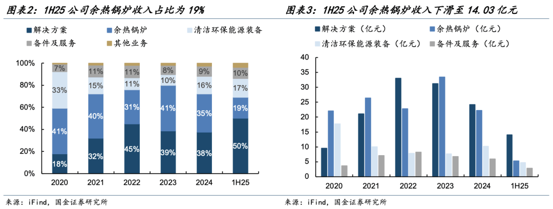 公司主要业务包括余热锅炉、清洁环保能源装备、解决方案、备件及服务等四大板块。1)余热锅炉主要包括燃机余热锅炉、干熄焦余热锅炉等产品,客户包括五大电力、钢铁、建材、水泥等高耗能行业企业。2)清洁环保能源装备包括垃圾焚烧锅炉、熔盐吸热器、换热器、储罐及核电设备等,主要用于垃圾废物处理厂、石化厂、核电站和光热项目等新能源领域。3)解决方案主要包括换热器及压力容器为核心设备的EP/EPC/PC等综合解决方案项目。4)备件主要包括过热器、省煤器等部件,服务包括技术服务、项目改造工程、维修维保等业务。