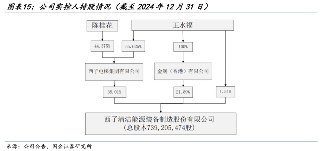 公司控股股东为西子电梯集团和金润(香港),实控人为前任董事长王水福先生。截至2024年底,公司第一大股东西子电梯集团持股39.01%,第二大股东金润(香港)持股21.89%,实控人王水福先生通过西子电梯集团持有公司39.01%的股份,通过金润(香港)有限公司持有公司 21.89%的股份,直接持有公司 1.51%股份,直接或间接持股62.41%。根据2025年9月24日公告,由于可转债转股,控股股东西子电梯集团、实控人王水福先生及其一致行动人金润(香港)合计持股比例被动稀释至55.18%。本次变动不改变控股股东和实控人地位,股权结构保持稳定。