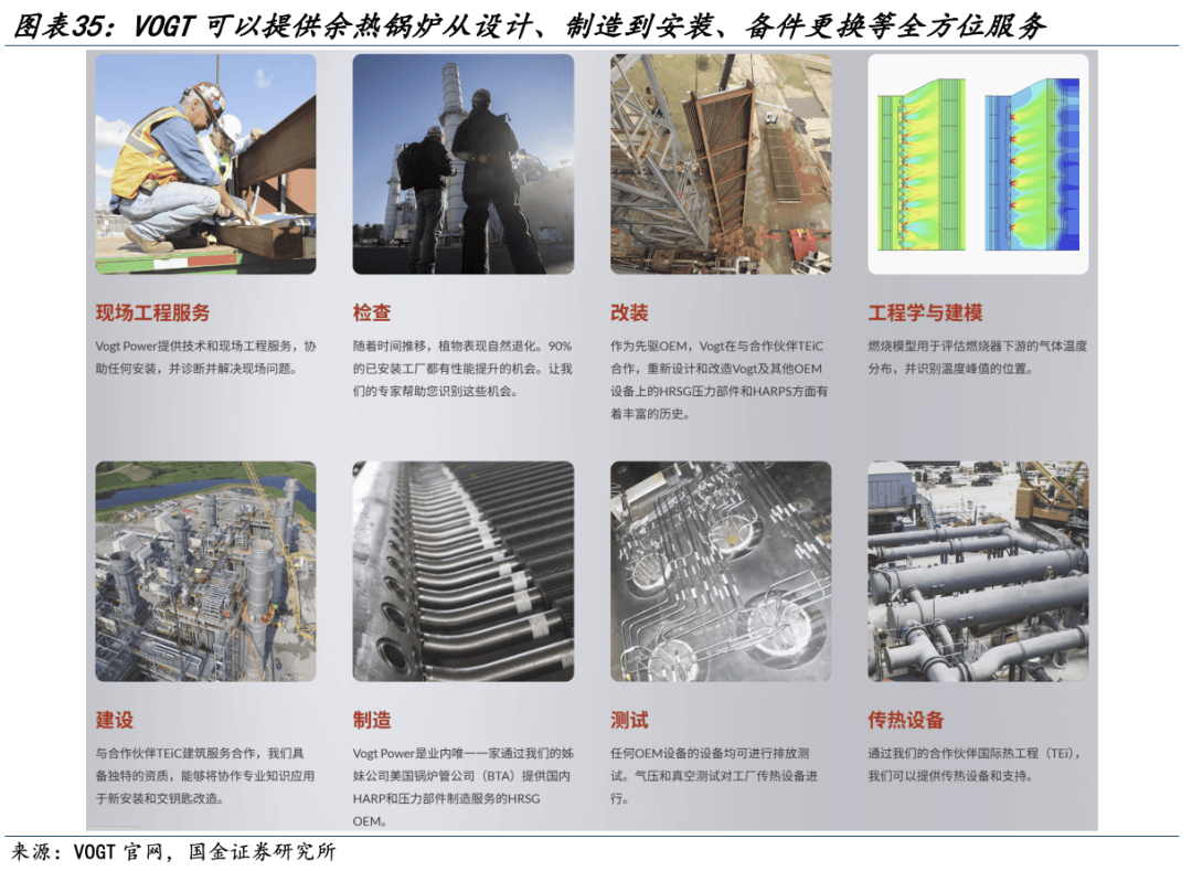 Vogt Power International是全球领先的余热锅炉(热回收蒸汽发生器HRSG)设计和制造商。由亨利·沃格特于1880年创立,1902年进入锅炉业务,1962年生产出第一台HRSG,目前产品已经出口到40多个国家,累计发货量超600多台。产品功率范围覆盖25MW-550MW或更高范围内的燃气轮机。除了余热锅炉整机制造,VOGT还提供现场安装、改造,以及风箱、分流器、管道、阀门等零部件更换和备件等服务。