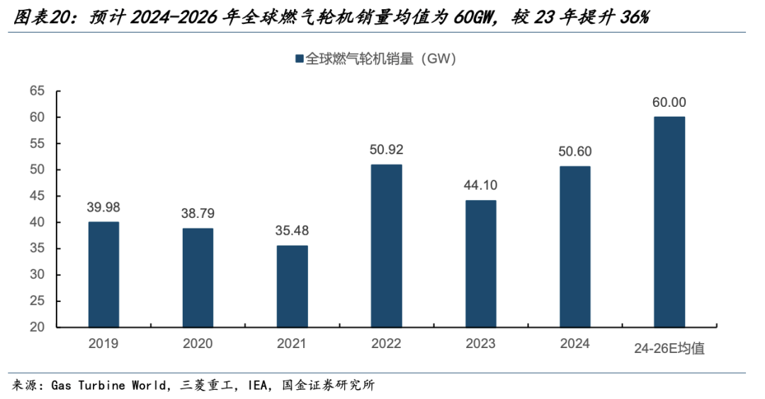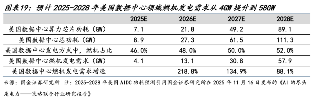 根据国金证券研究所电子行业组在《AI的尽头是电力——策略联合行业研究报告》中的测算,2025-2028年美国数据中心算力芯片功耗预计从7.1GW提升到89.1GW,考虑到冷却系统等耗电,算力芯片约占整个数据中心功耗的80%,美国数据中心总功耗约从8.9GW提升到111.3GW。我们考虑到燃气轮机发电成本低、发电稳定、启动速度快等优势,未来在AIDC领域的渗透率有望持续提升,我们假设2025-2028年美国AIDC领域燃机发电占比将逐步从46%提升到52%左右,则美国AIDC对应燃机需求为4.1GW-57.9GW,26-28年增速分别为219%/135%/88%。