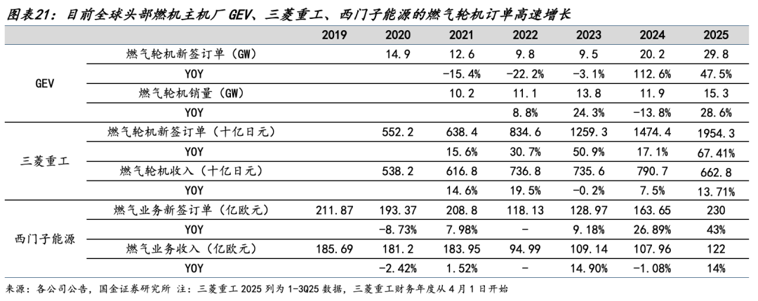 全球燃机行业格局集中,头部主机厂订单高增,在手订单覆盖年限超过4年。目前全球燃机主要为GEV、三菱、西门子能源等公司垄断,2023年三家公司全球份额合计达81.64%。以GEV为例,24年燃机新签订单20.2GW,同比+113%,2025年订单同比+47.5%,保持高增。在手订单方面,GEV在2025年末的电力业务的在手订单943.87亿美元,按照电力业务2025年收入计算,在手订单覆盖年限已达4.8年。西门子能源25财年末,燃气服务板块在手订单540亿欧元,按照2025财年收入122亿欧元计算,当前订单可见度已达4.4年。