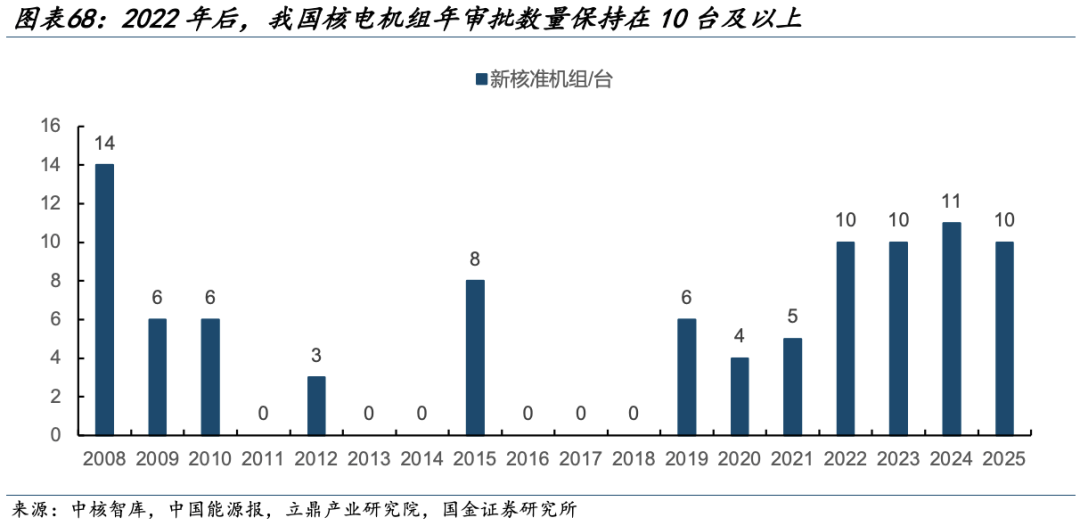核电项目审批回暖,持续拉动核电设备需求释放。自2011年日本福岛发生核安全事故以来,我国的核电审批进展缓慢。根据中国核能行业协会,2011-2018年我国仅核准11台机组。2019年我国核电审批重新启动,结束了三年的“零审批”状态。2019-2025年,我国核准核电机组数量分别为6/4/5/10/10/11/10台,近四年我国每年核准机组10台及以上,持续保持积极安全有序发展的良好势头,有望拉动核电设备需求释放。