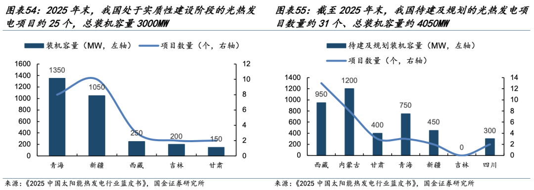 我国目前在建、待建及规划的光热发电项目较多,未来装机规模有望持续高增。根据太阳能光热产业技术创新战略联盟统计,截至2025年末,我国处于实质性建设阶段的光热发电项目约25个,总装机容量3000MW。我国待建及规划的太阳能热发电项目数量约31个、总装机容量约4050MW。按照国际能源署预测,中国光热发电市场到2030年将达到29GW装机,到2040年翻至88GW装机,到2050年将达到118GW装机。